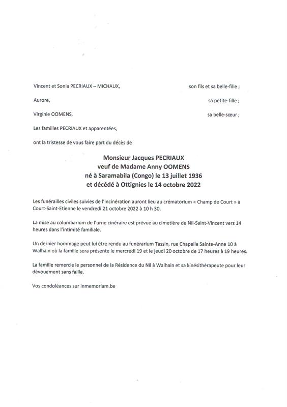 Décédé à Ottignies (1340) le vendredi 14 octobre 2022 à l'âge de 86 ans