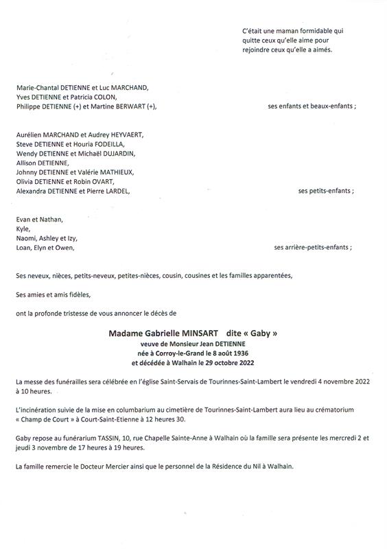 Décédée à Walhain (1457) le samedi 29 octobre 2022 à l'âge de 86 ans