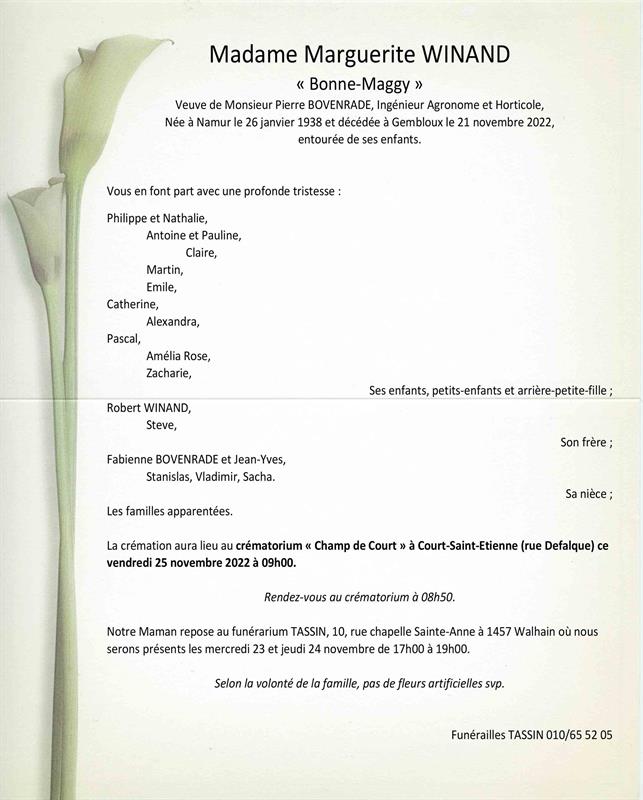 Décédée à Gembloux (5030) le lundi 21 novembre 2022 à l'âge de 84 ans