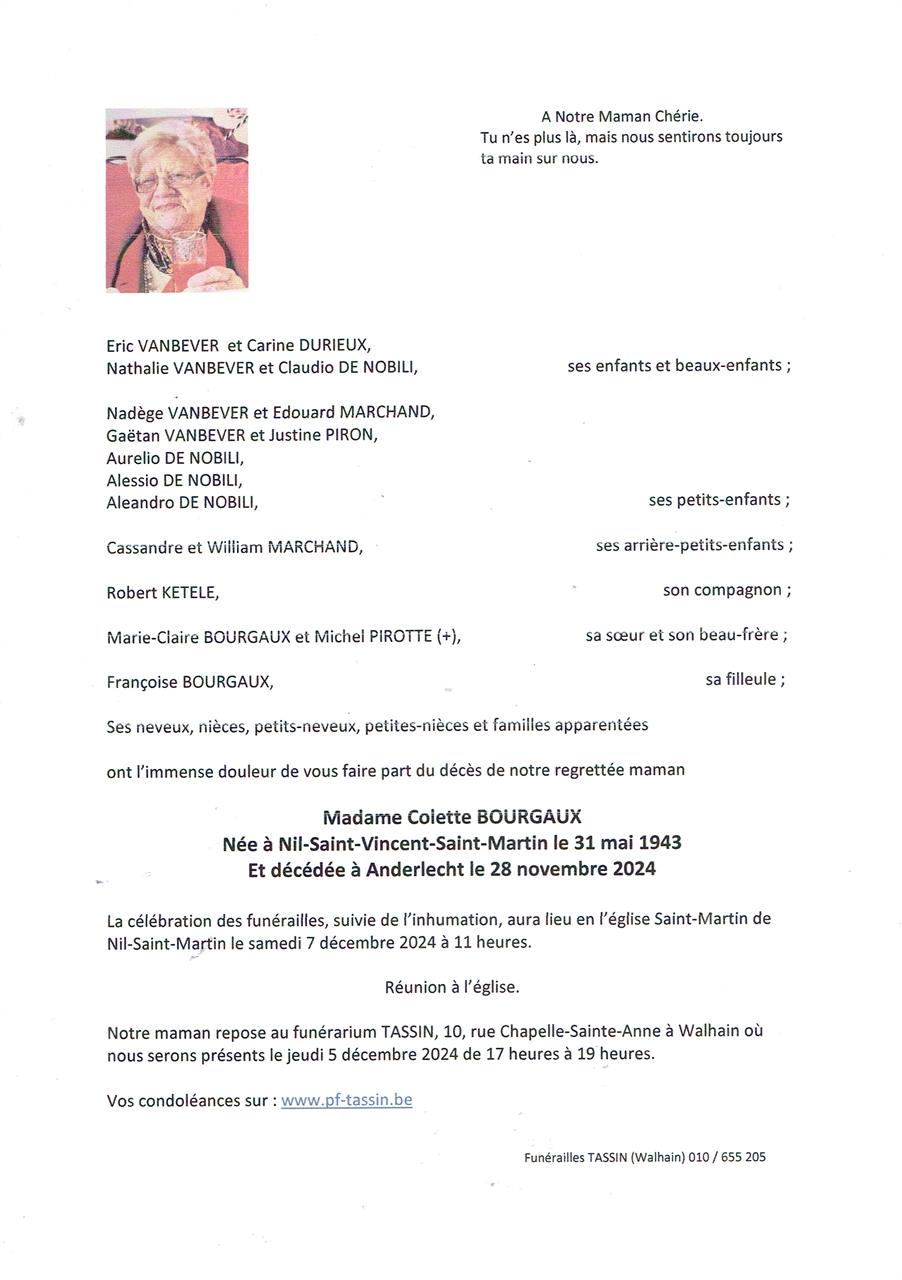 Décédée à Anderlecht (1070) le jeudi 28 novembre 2024 à l'âge de 81 ans