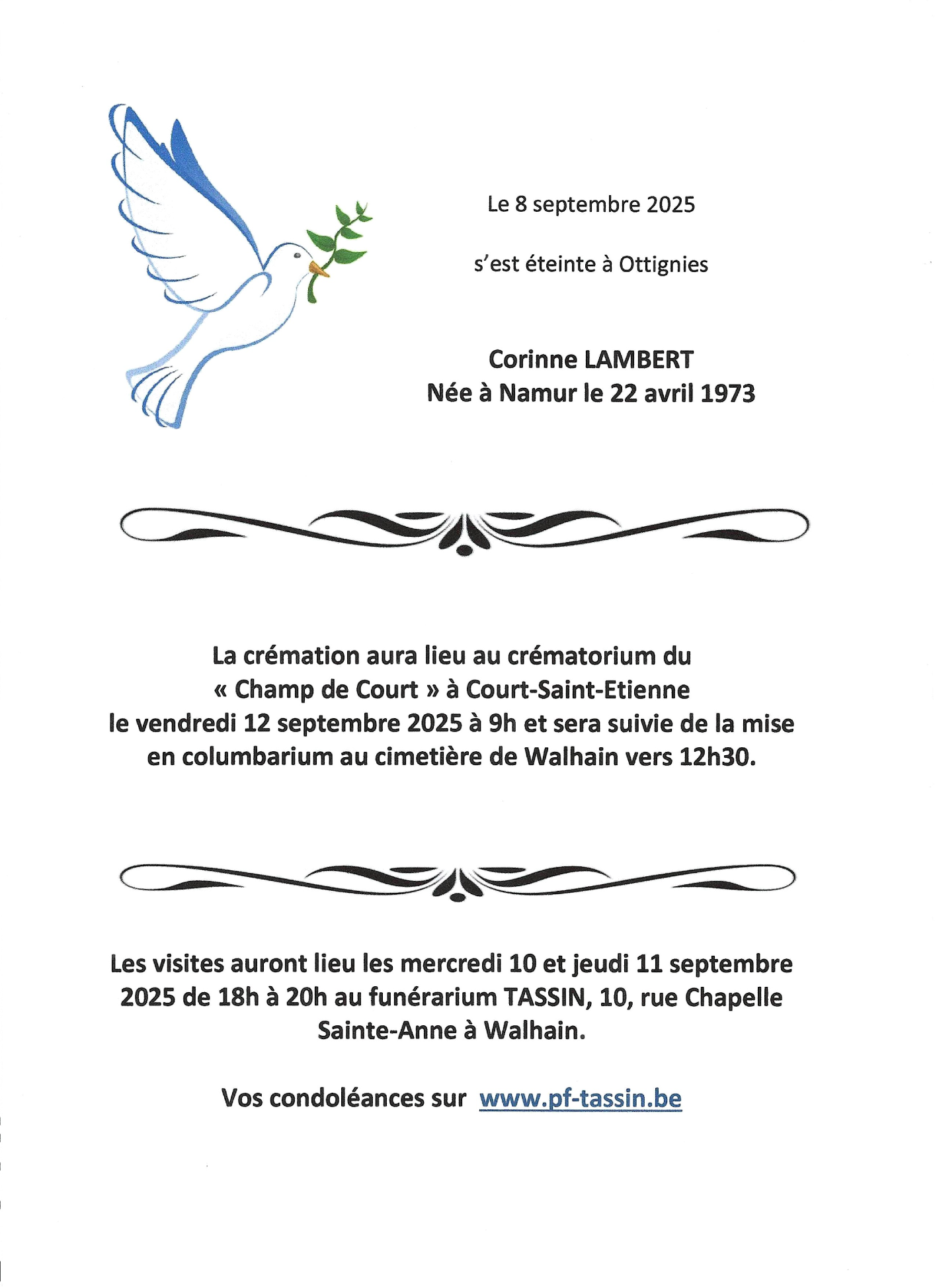 Décédée à Ottignies (1340) le lundi 8 septembre 2025 à l'âge de 52 ans