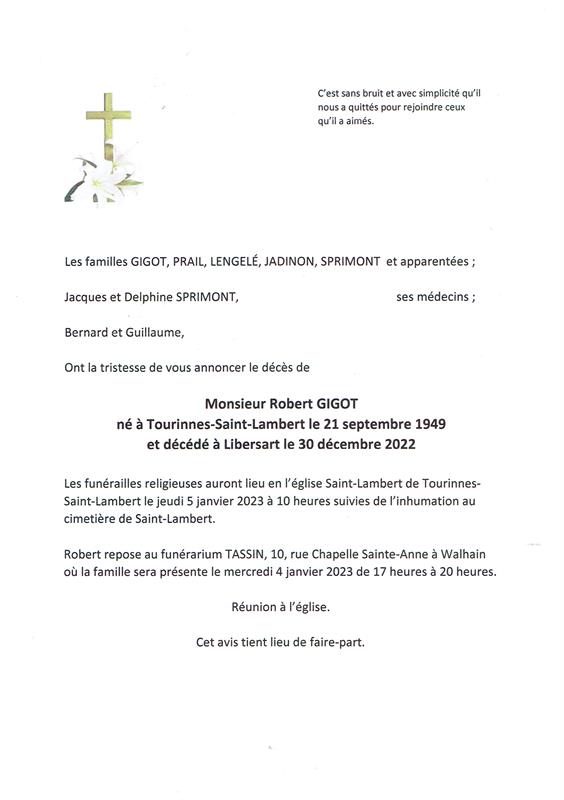 Décédé à Libersart (1457) le vendredi 30 décembre 2022 à l'âge de 73 ans