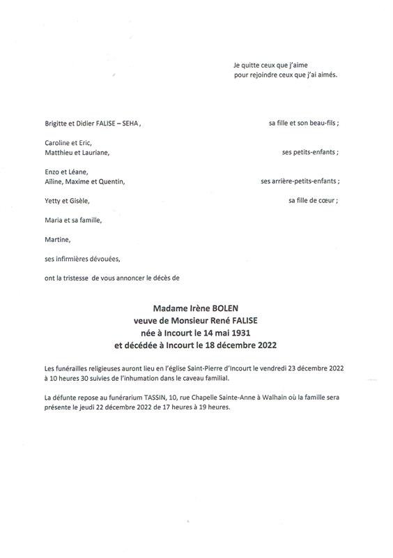 Décédée à Incourt (1315) le dimanche 18 décembre 2022 à l'âge de 91 ans