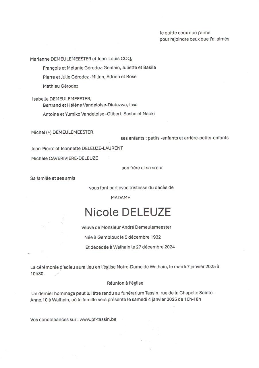 Madame Nicole DEMEULEMEESTER née DELEUZE